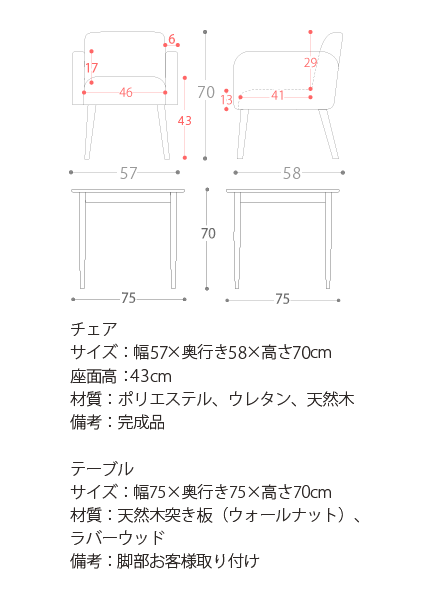 組み立て簡単仕様です(工具付属)チェアサイズ:幅57×奥行き58×高さ70cm座面高:43cm材質:ポリエステル、ウレタン、天然木備考:完成品※2012年6月販売分より脚部色味と座面デザインが一部変更になっております。