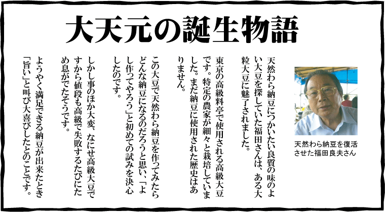 ○品名:納豆 ○内容量:300g ○原材料名:国産大豆 ○賞味期限:別途商品ラベルに記載 ○保存方法:冷蔵で保存 ○原産国名:日本 ○製造者:(株)フクダ日本にこんなに うまい大つぶ大豆が あったのか NHKのテレビの取材でご同行された、発酵学の権威である「小泉武夫」先生がこの「大天元」を食べて、「生涯に一度、一生に一度食べたい納豆」と色紙に書いてくれた納豆です 。