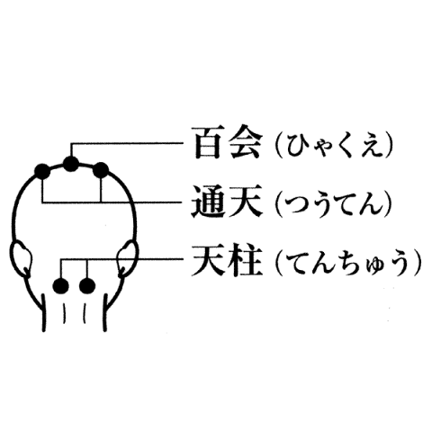 育毛に効果のある3つのツボ 百会:頭頂部の中央部分 通天:額の生え際より親指の幅4つ分のところ 天柱:後頭部えり足にある2本の太い筋肉外側のくぼみ ※発毛・育毛効果は徐々に発揮されますので、毎日根気よくご使用ください。