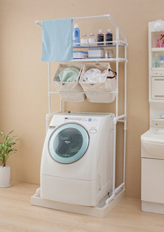 2枚の棚を有効活用できます!(メッシュ棚:タオルなどの小物置きに、フラット棚:洗剤などの小物置きに)洗濯パンの上に取り付け可能です。